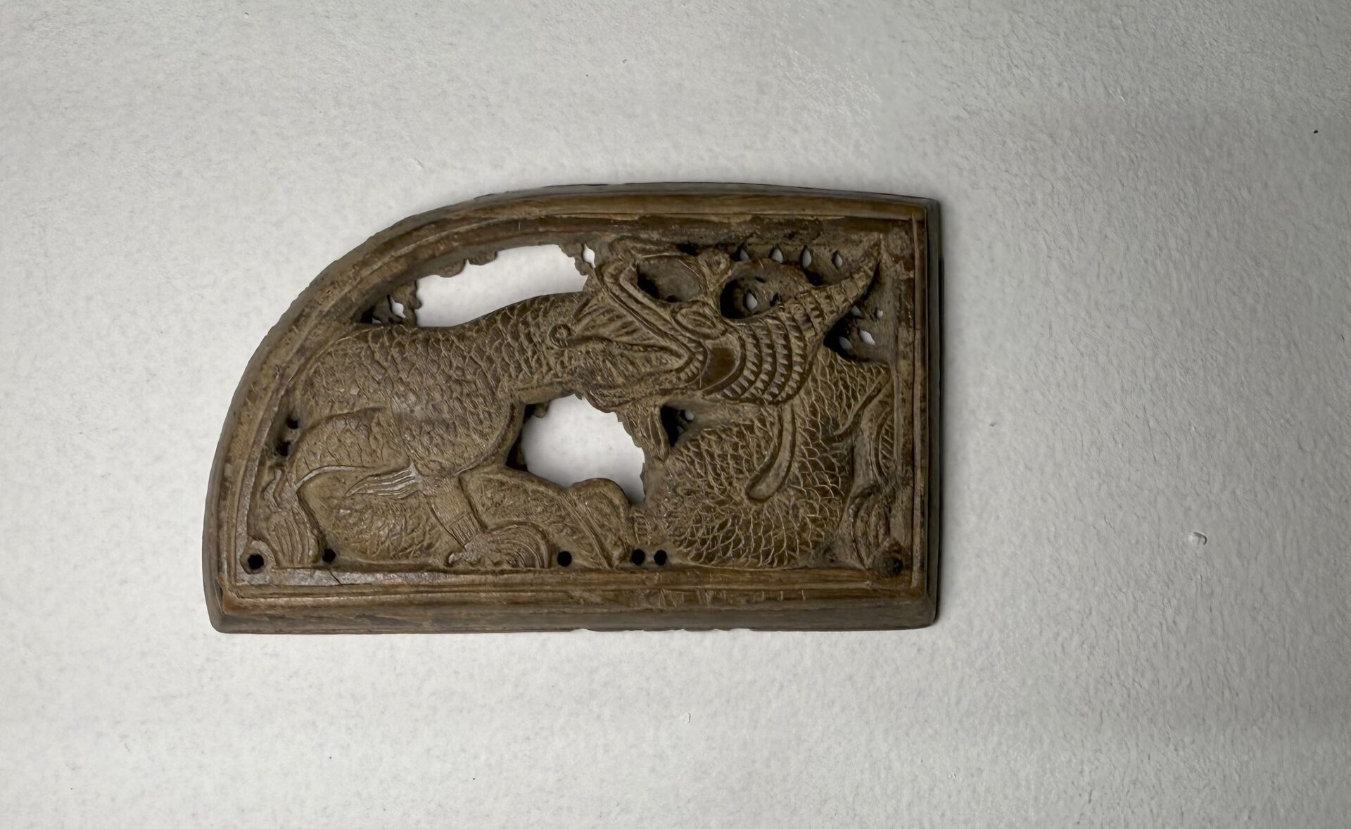 На накладке изображен дракон, пожирающий барса. Вероятно, она была парная, могла быть сделана для украшения ларца (как предположение). Ученым еще только предстоит изучить