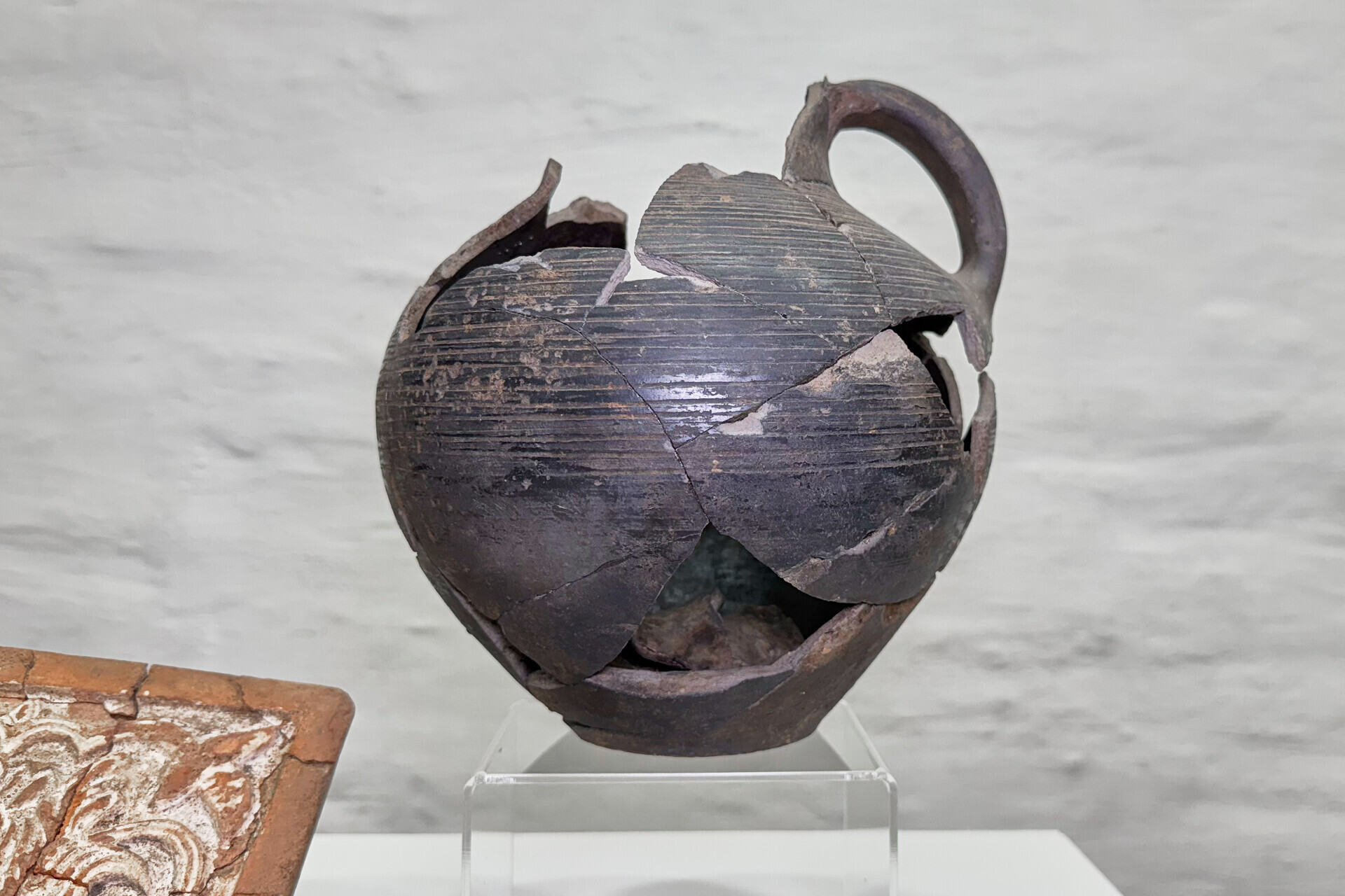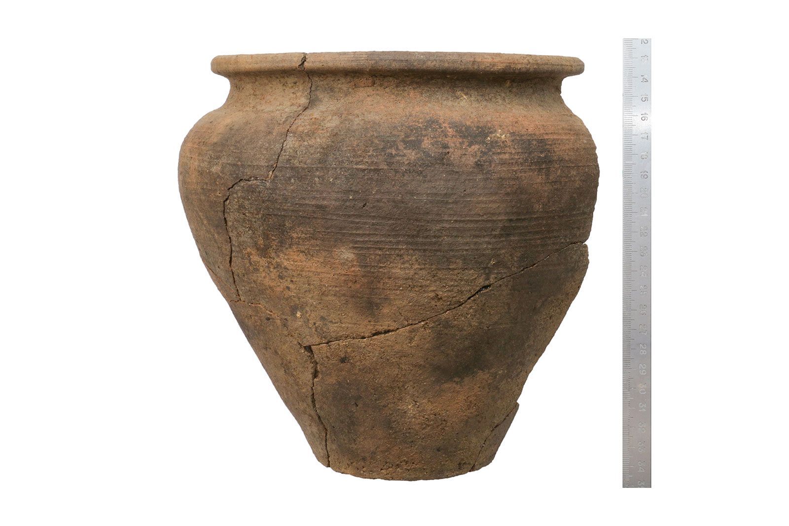 Большой кувшин для хранения жидкостей. По итогам археологических исследований среди массового керамического материала реставраторы собрали несколько керамических сосудов средневековой Москвы. Не все фрагменты сохранились, но полная форма собралась.