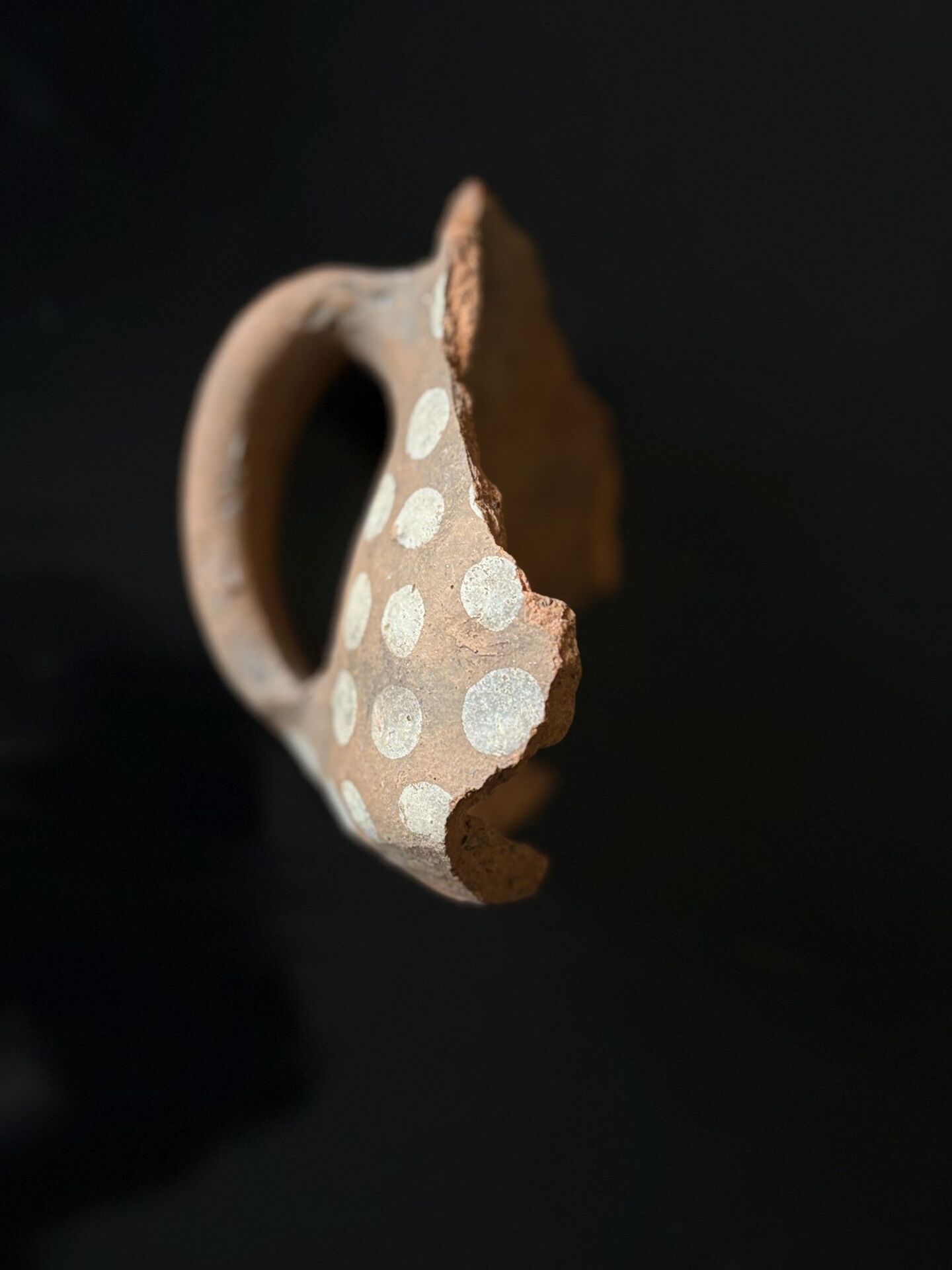 Красноглиняная керамика – самая распространенная в XIV–XVI веках. Преимущественно она употреблялась в качестве кухонной посуды, изготовлялась из красножгущихся глин. Наиболее известные месторождения их в городе были на Яузском холме, где размещалась одна из древнейших ремесленных слобод города – Гончарная. Для украшения посуды на керамику наносили рисунок в виде горошин, пятна белого ангоба придавали праздничный, парадный вид столу. Подобную красноглиняную кружку ранее уже находили на территории Кремля.