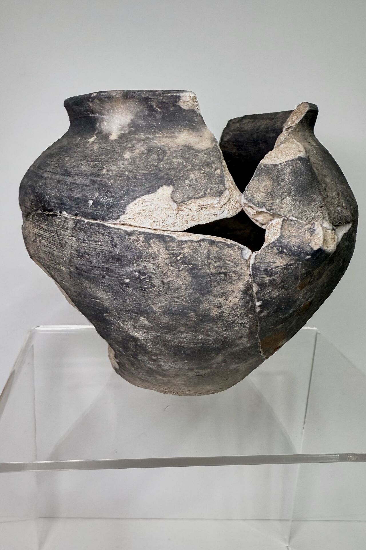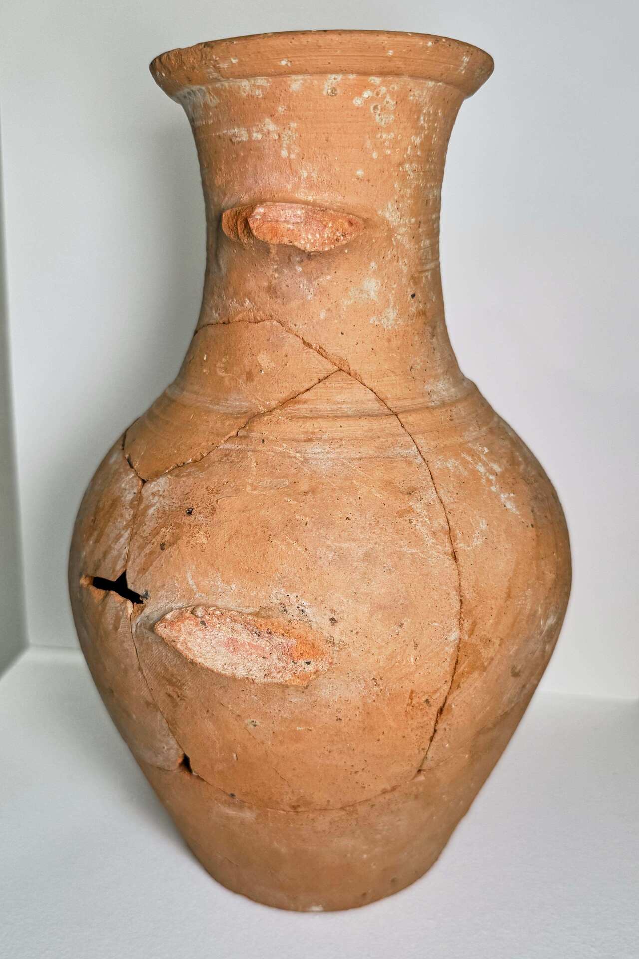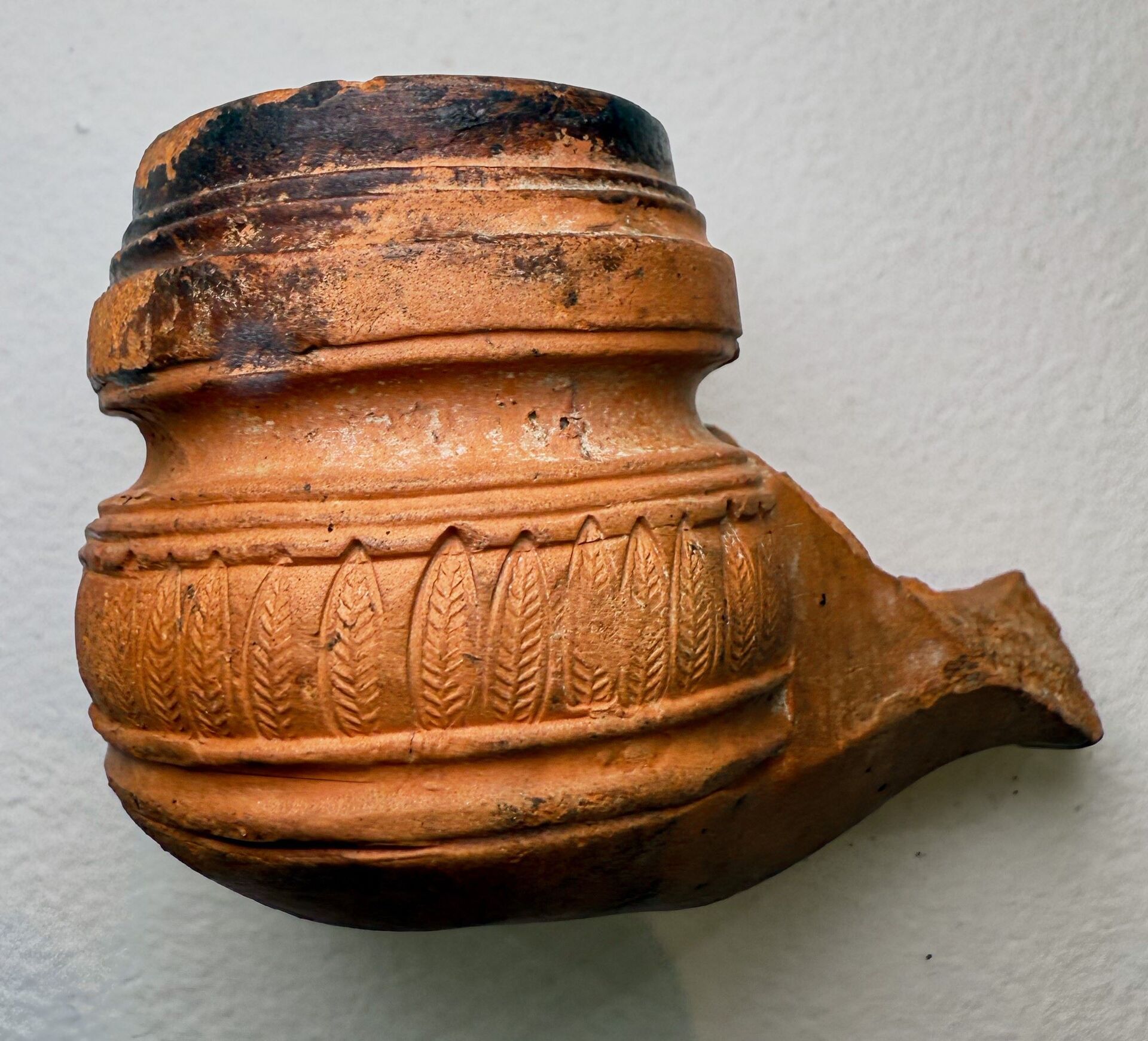 Выполнен из красной глины, до обжига гладкой палочкой по тулову сосуда был нанесен методом лощения рисунок, который после обжига дал другую тональность декору.