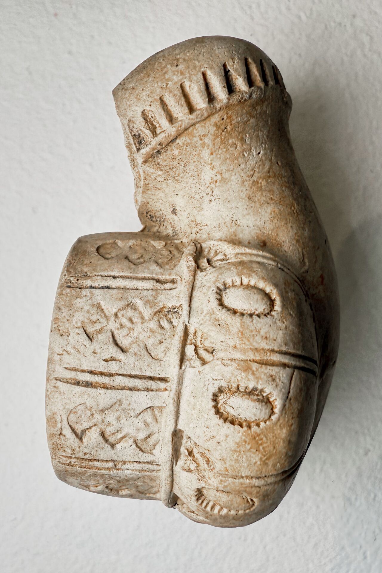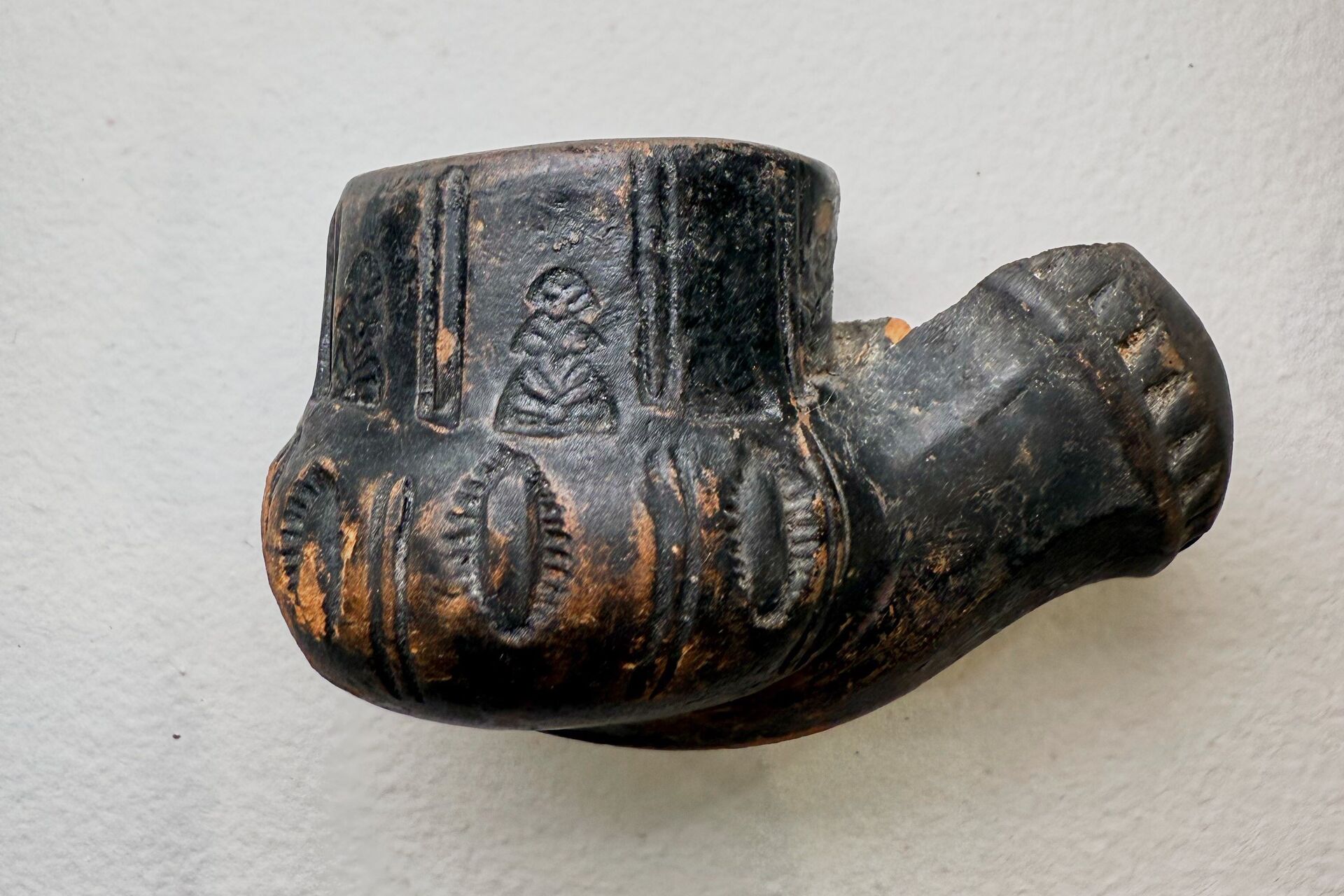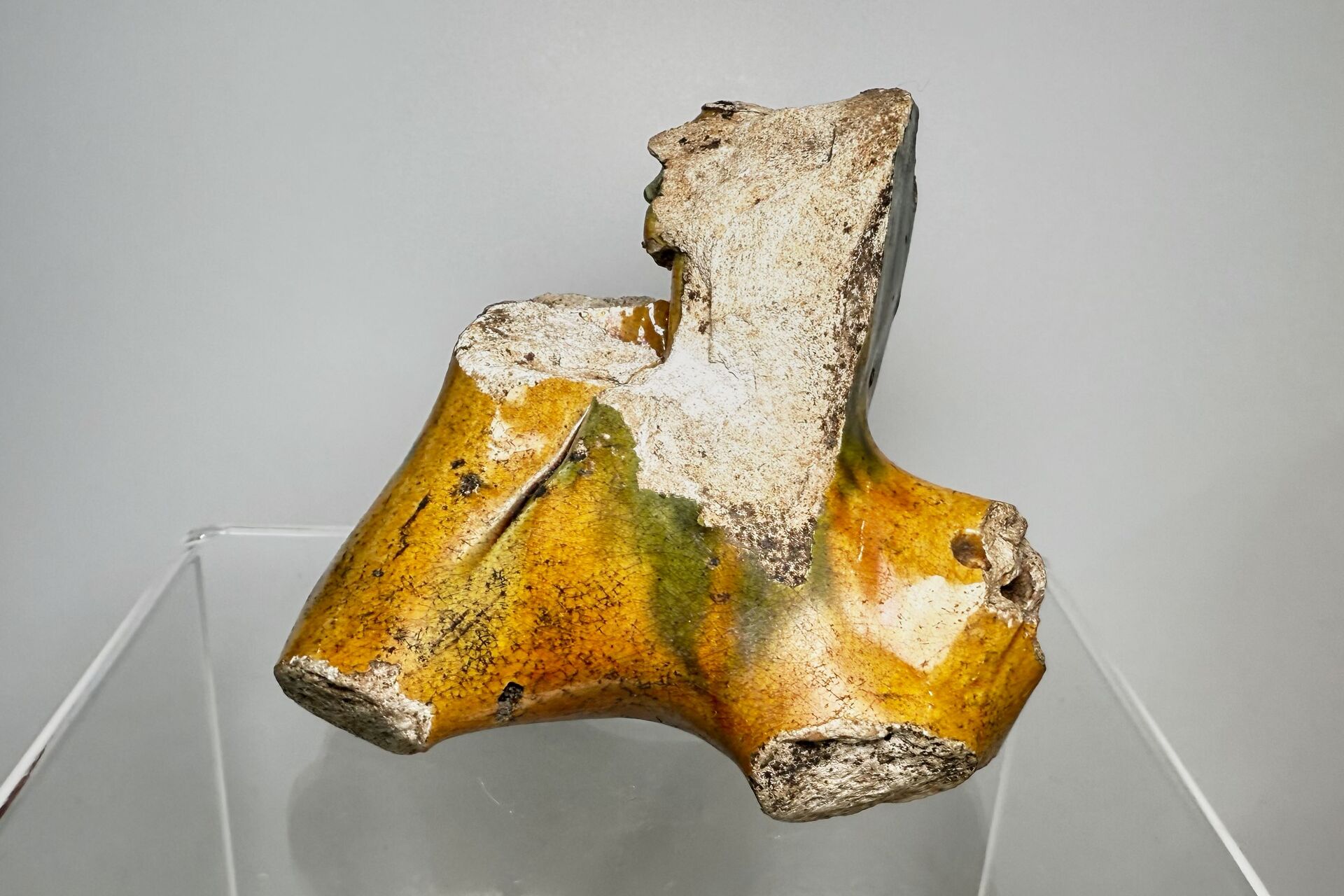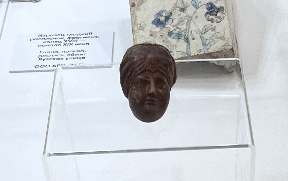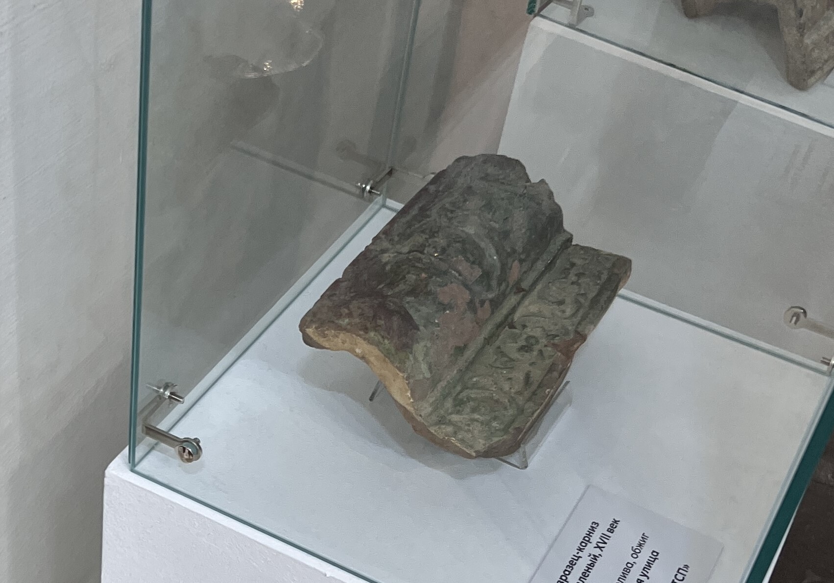 из белой глины и зеленой поливы в виде кибитки, в которой сидят два человечка. По этому предмету можно представить, как выглядели городские экипажи.