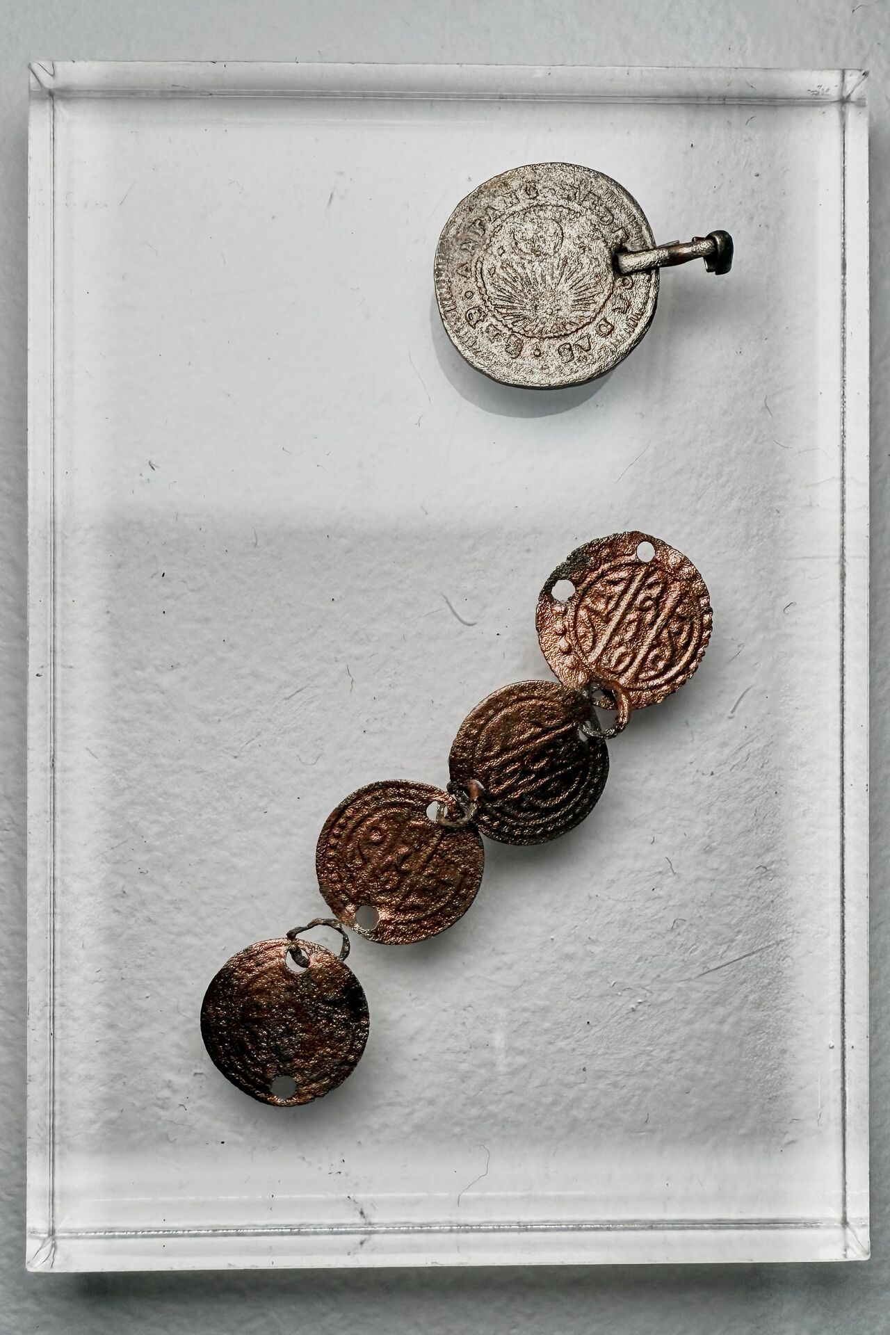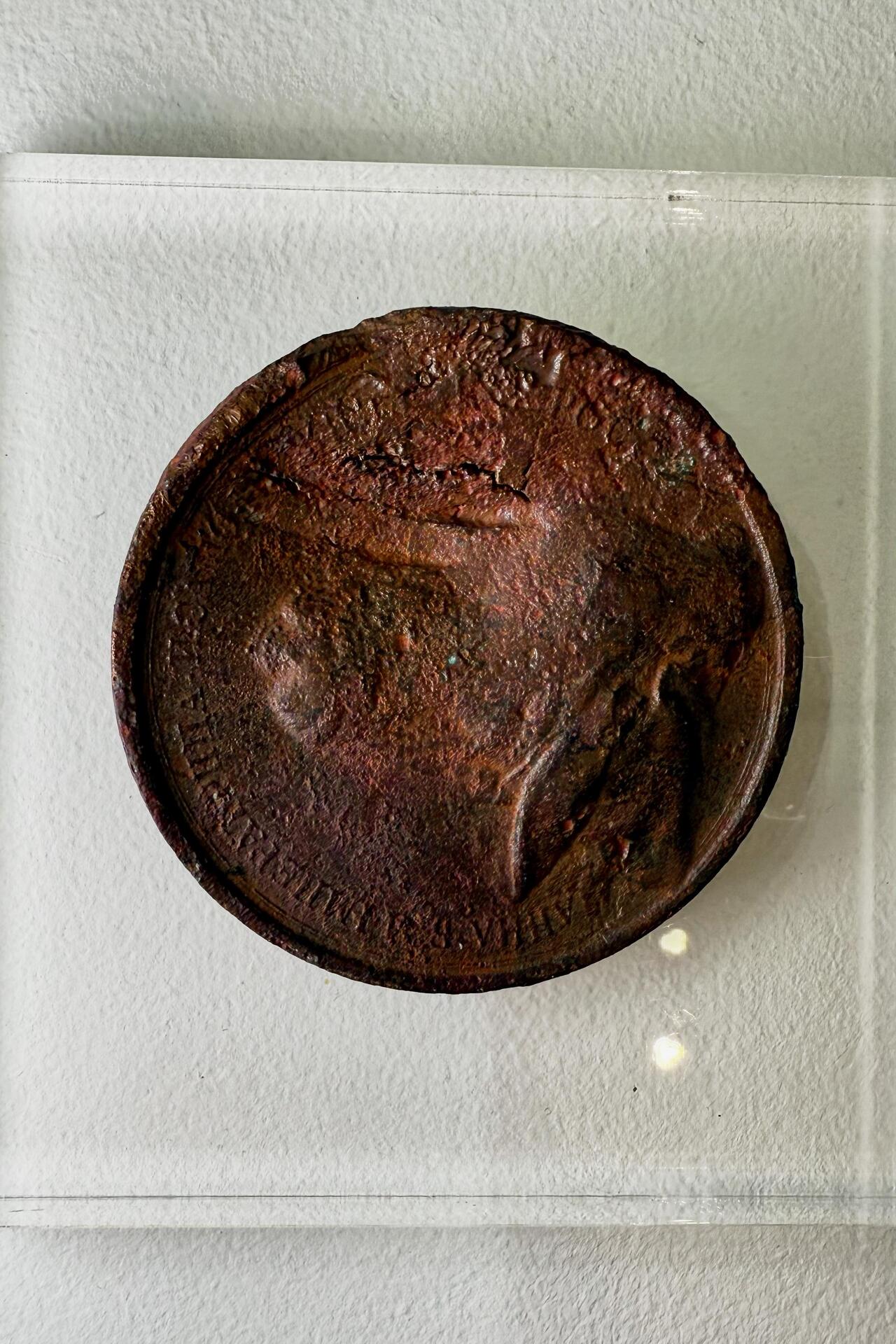 Медаль сильно коррозирована, однако реставраторам удалось бережно очистить и сохранить предмет.