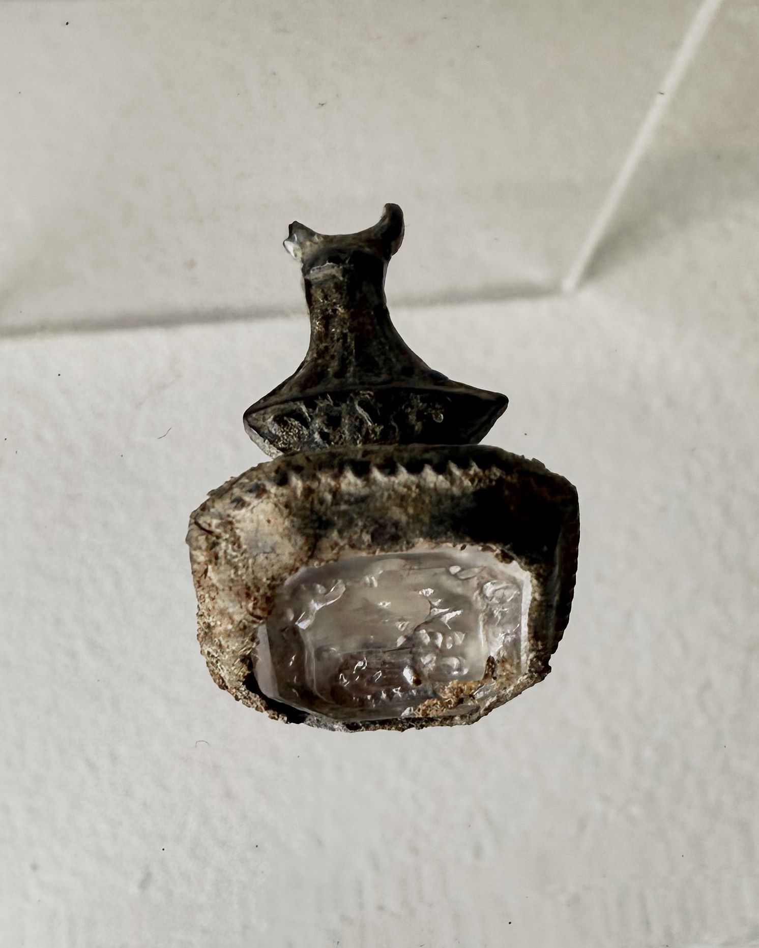 Перстень с округлым щитком с изображением короны (?) и растительным орнаментом.