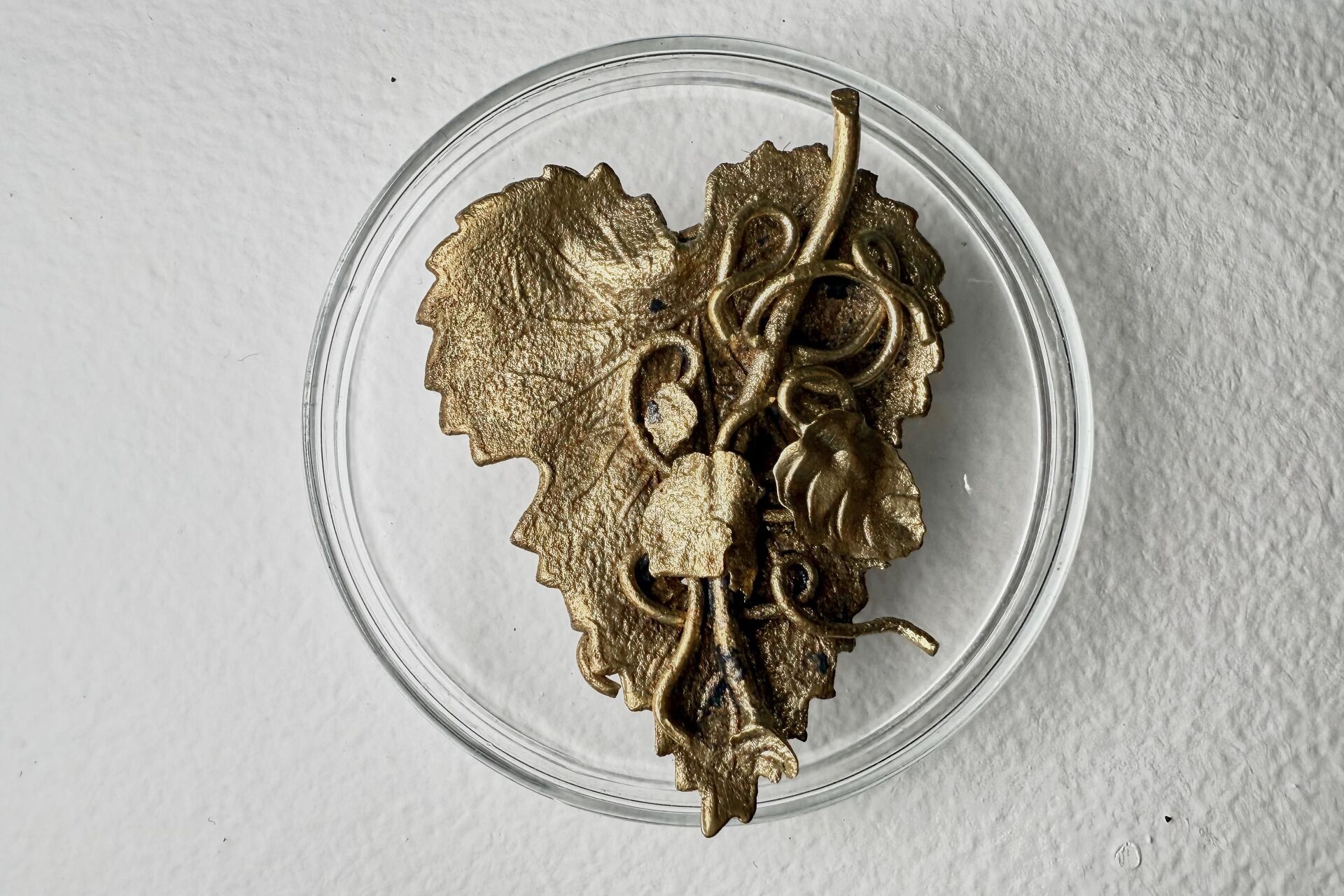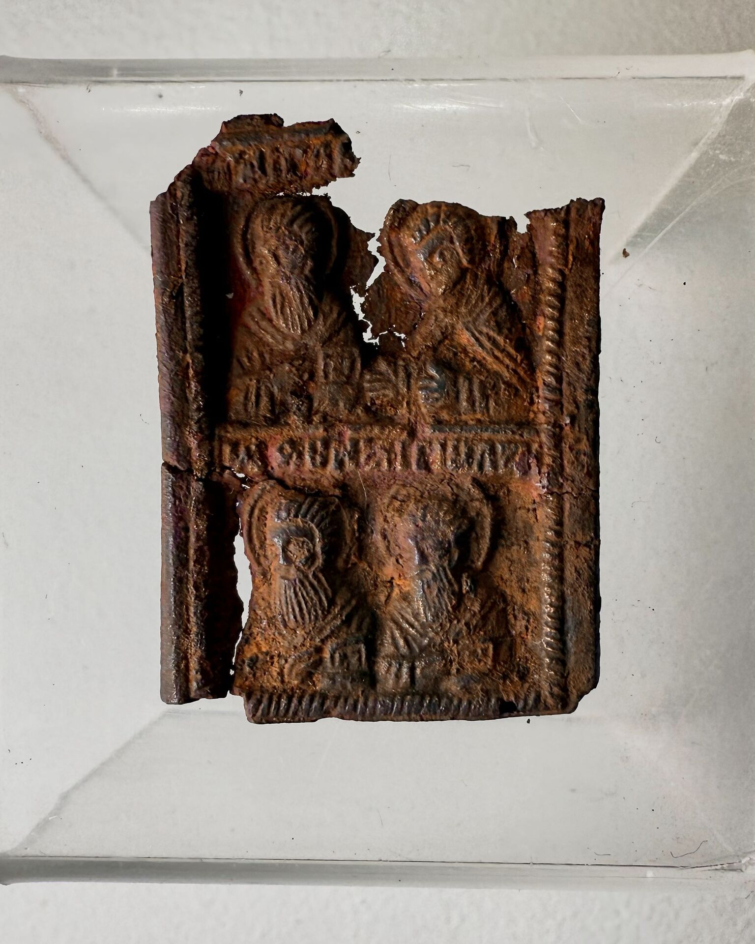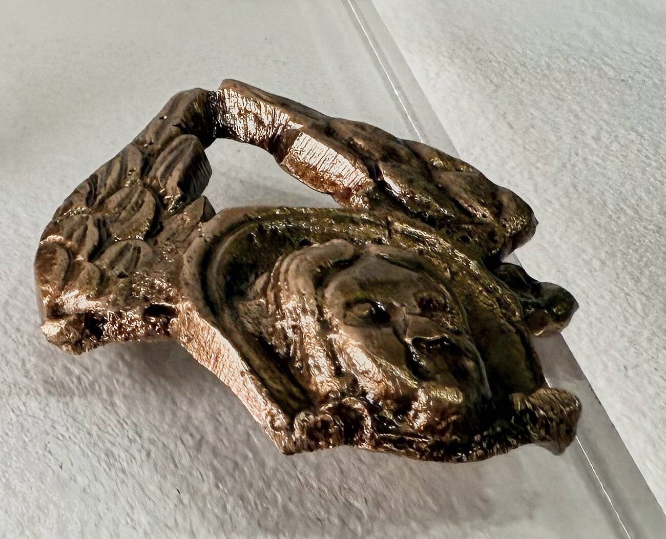 Медная накладка в виде головы Херувима. Относится к церковной утвари. Могла быть выполнена как деталь иконы или наперстного креста.