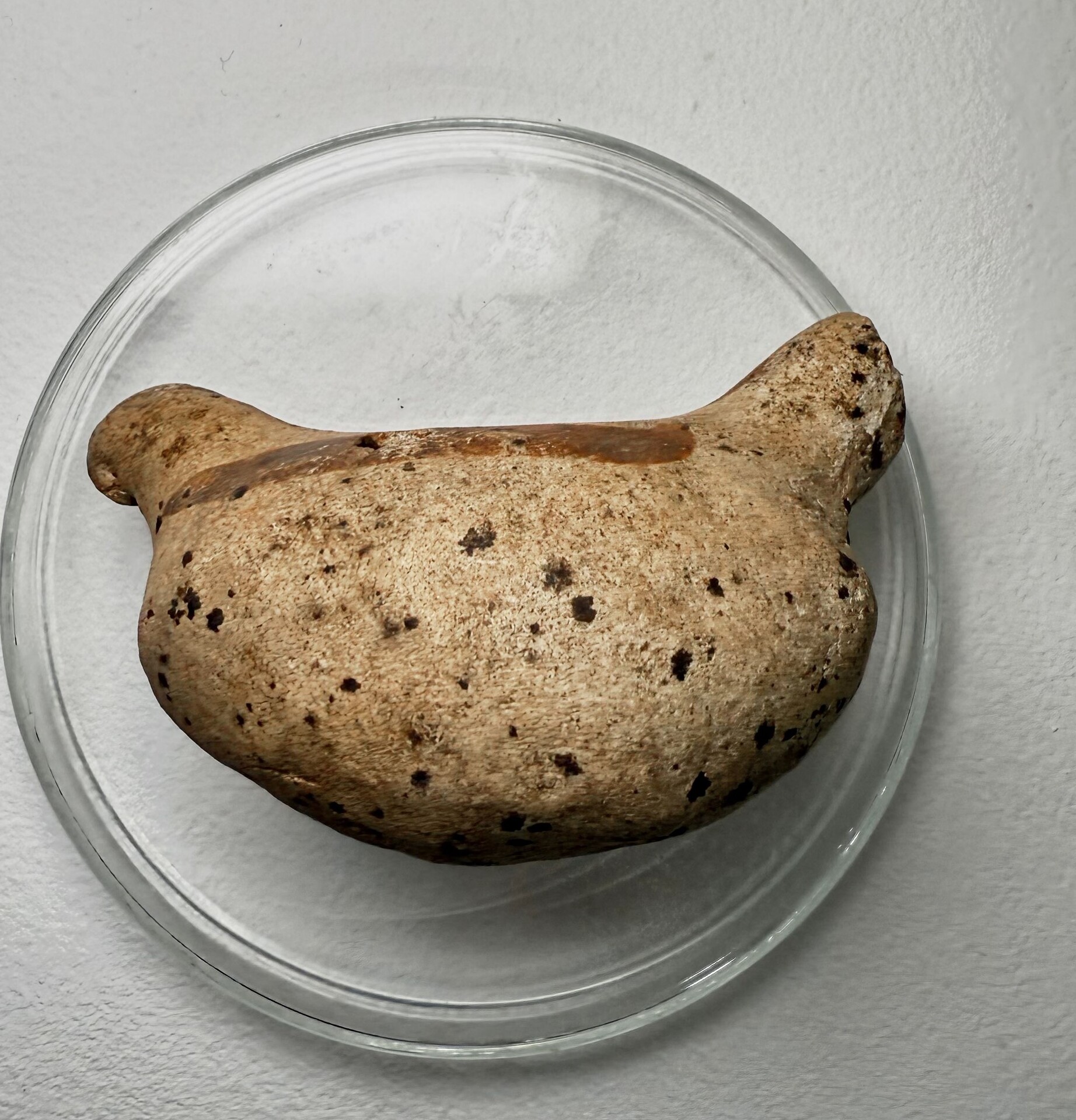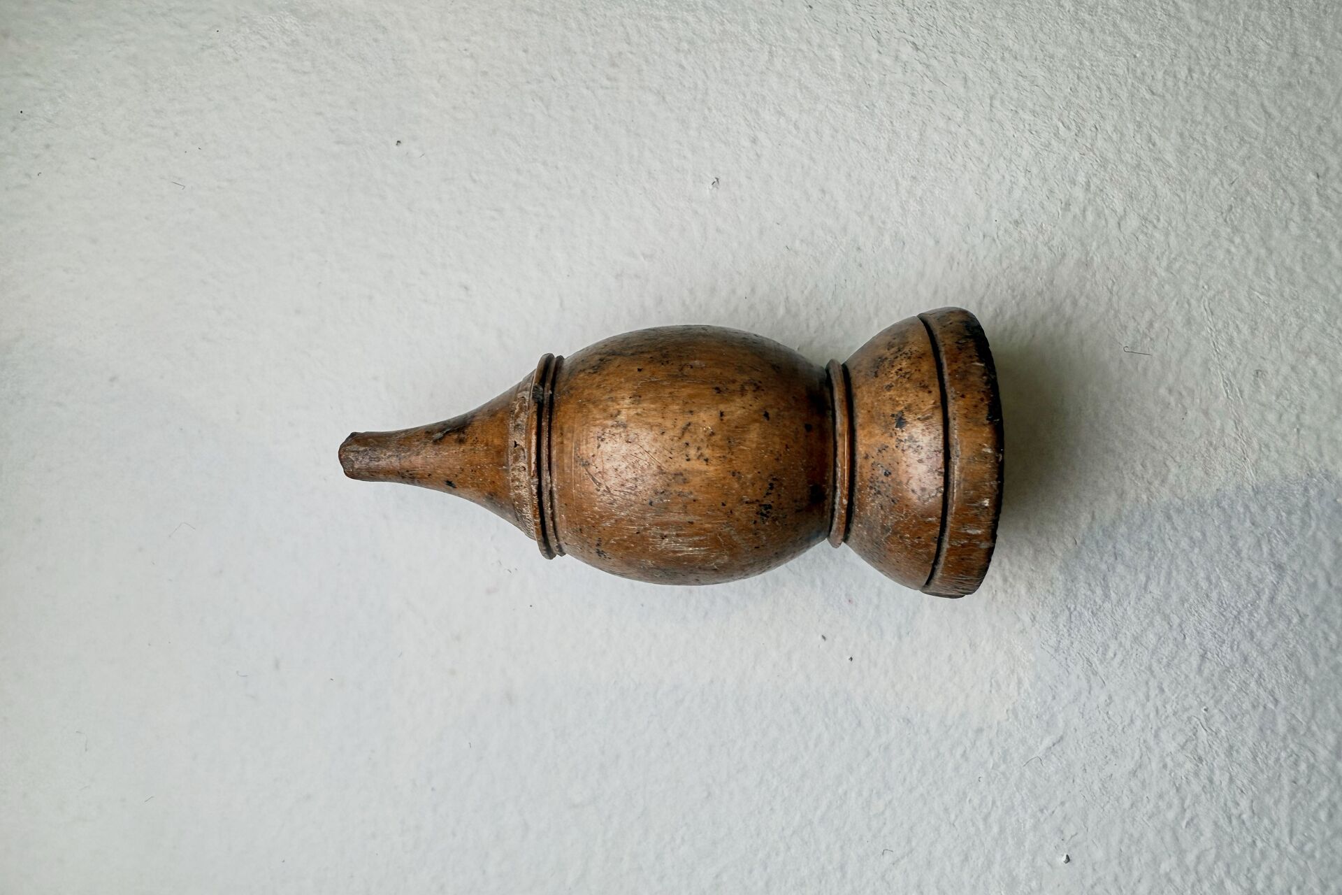 Белоглиняная игрушка-погремушка, полая внутри и с маленьким шариком, который издает звуки. Подвешивалась