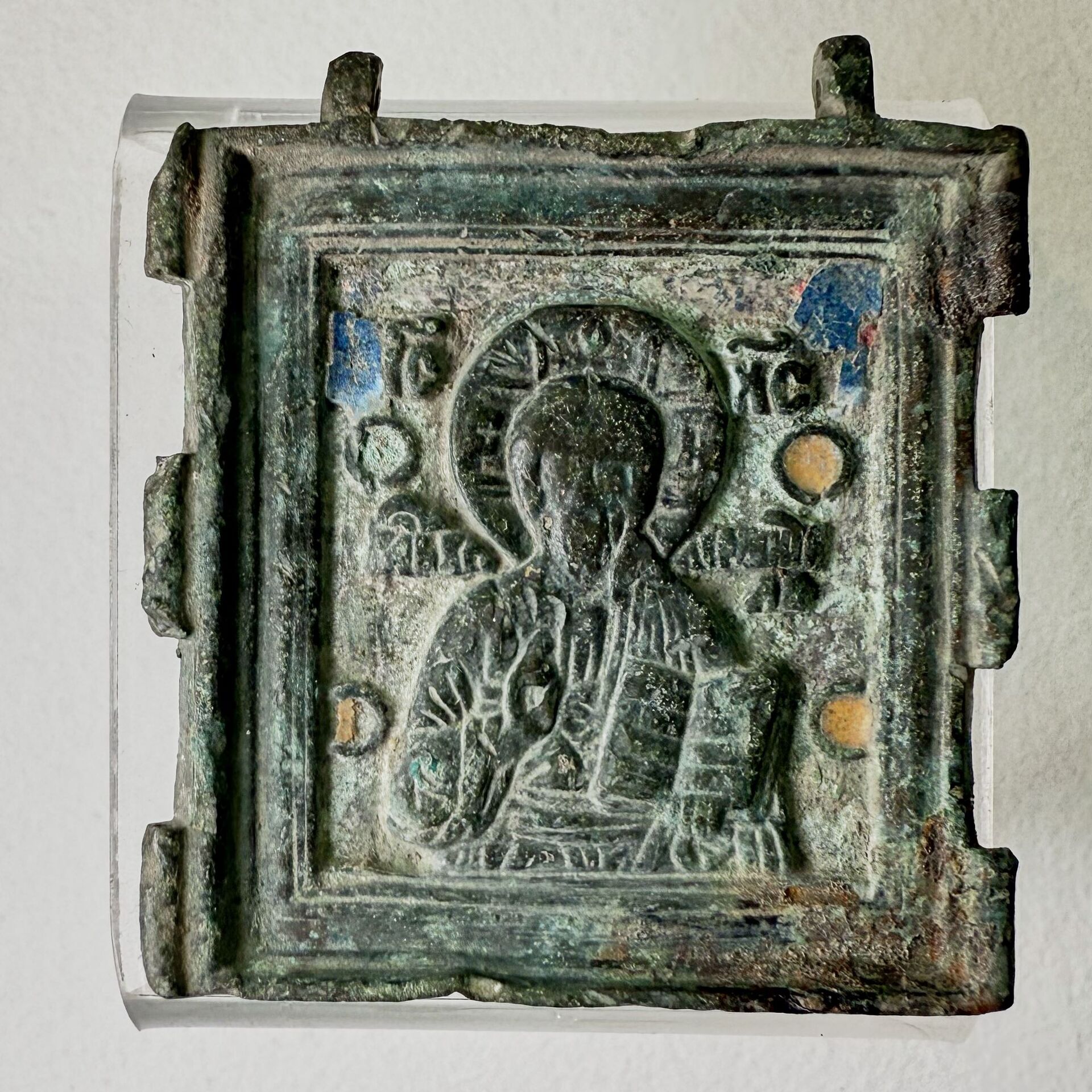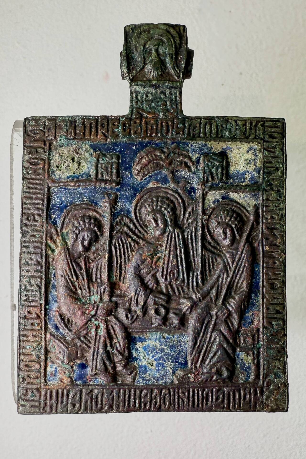 В центре – Христос, сидящий на престоле, по сторонам – Богоматерь и Иоанн Предтеча в трехчетвертном повороте к центру. Изображение на медной иконе повторяет каменные и костяные образцы мелкой пластики XV в.