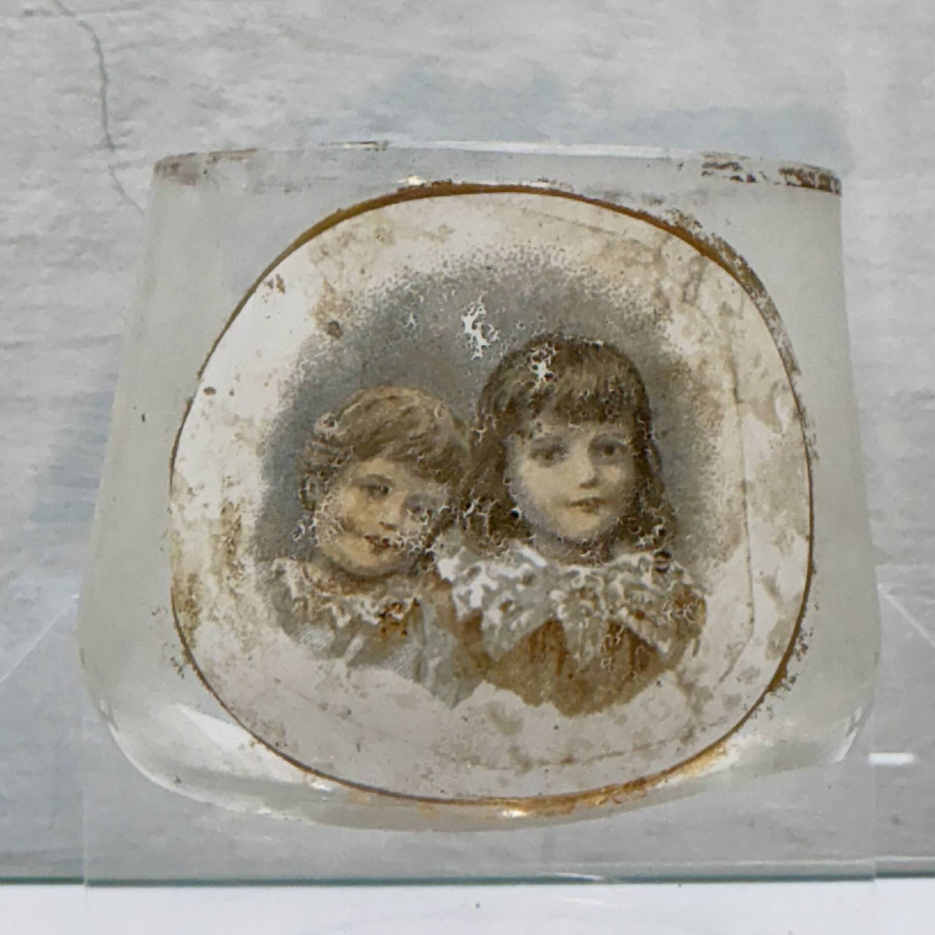 Стеклянный бокал с удивительным расписным рисунком, на котором изображены дети. Мальчик помладше