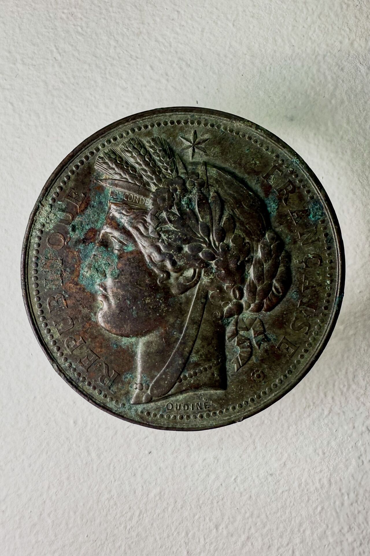 для проведения выставки) и женский профиль, символизирующий Францию.