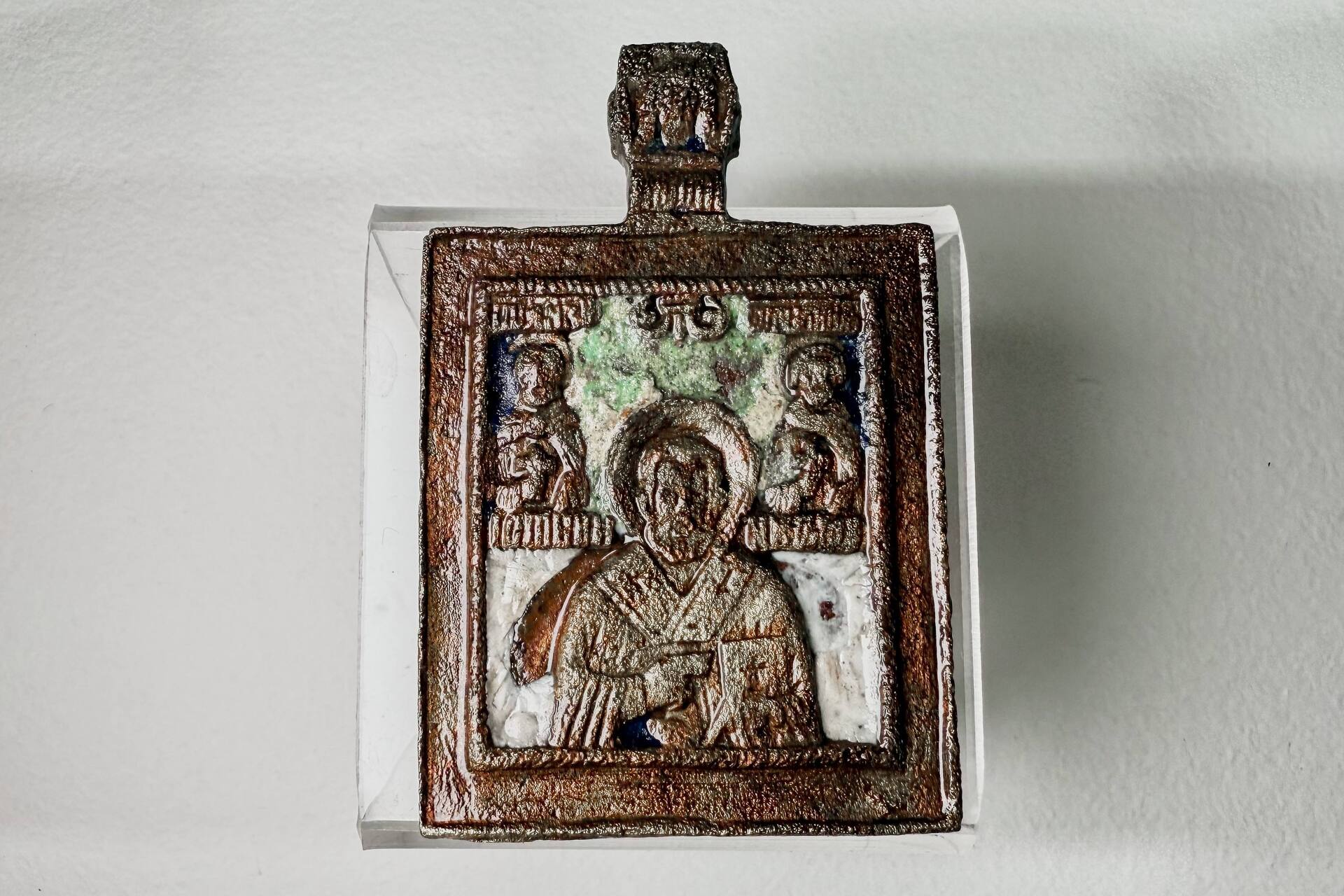 Изображение Николая Чудотворца, выполнена с использованием разноцветной поливы, что придает