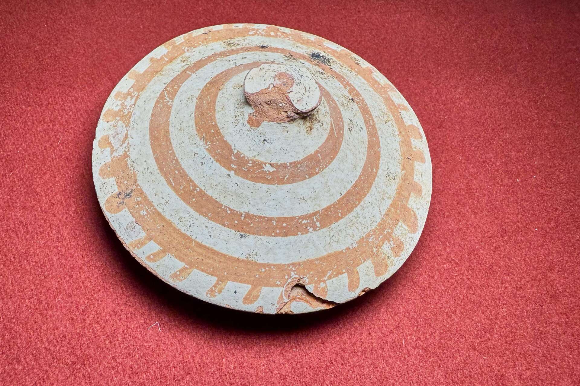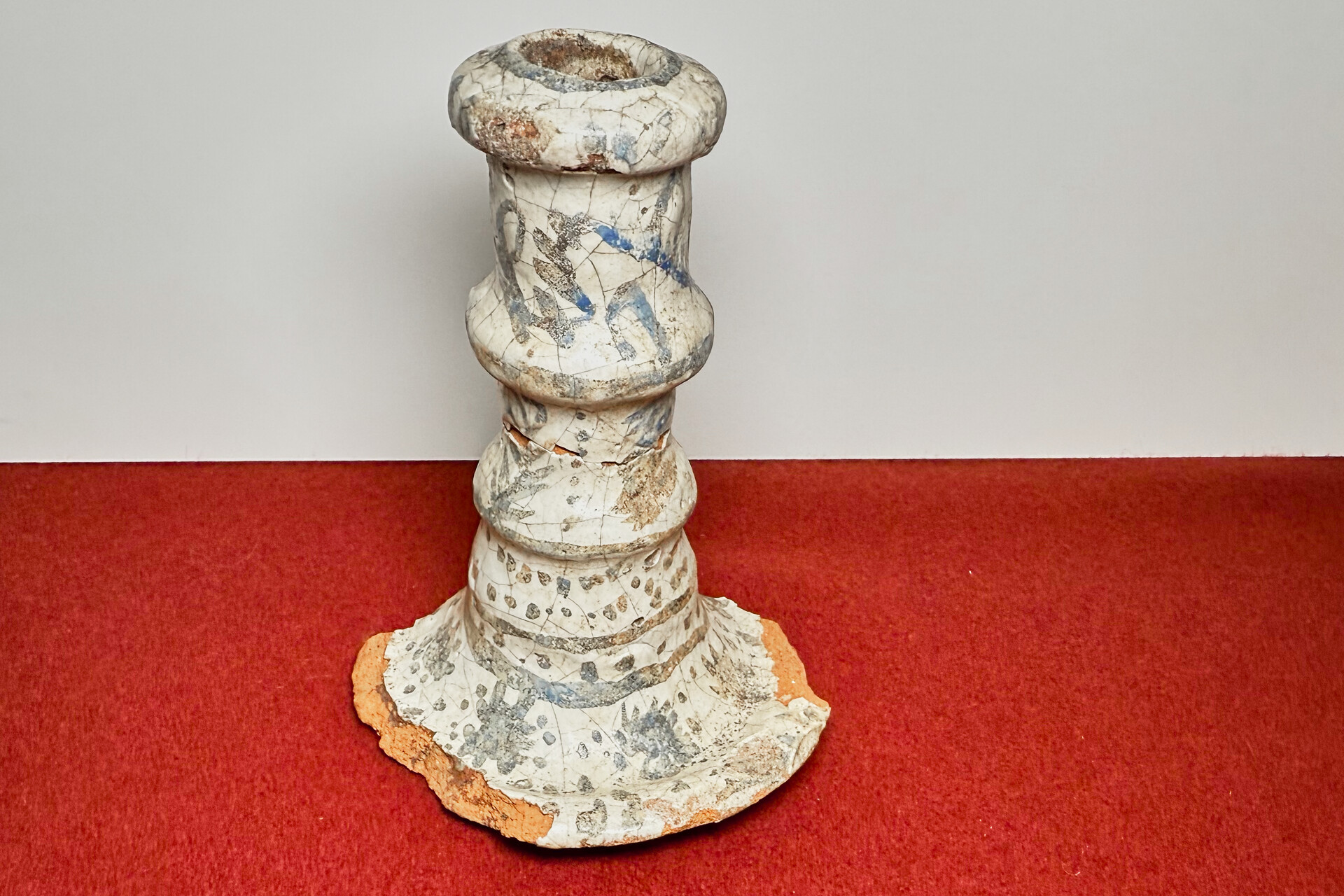 из красной глины, покрыт белой поливой и синей росписью с растительным орнаментом.